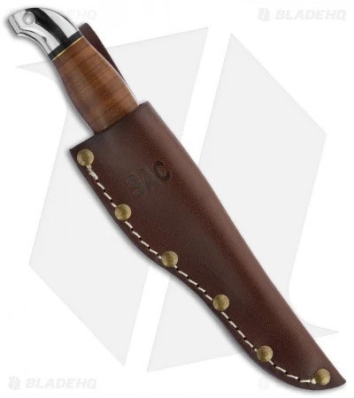 The Boker Plus Air Force Pilot Survival knife has a SK5 carbon steel blade, mirror finished. The handle is crafted of leather, with aluminum and brass spacers and pommel. Includes an SAC leather sheath.