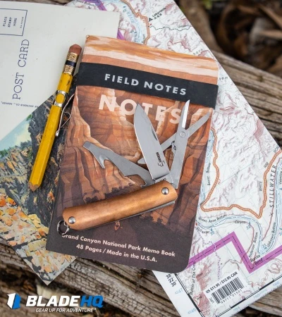 This Blade HQ Exclusive Boker Mini Tech Tool 4 features a knife, scissors, cap lifter, seat belt cutter, and flat head scredriver. This bite-size multi tool has functionality that belies it’s size. It’s got contoured copper scales giving it comfortable grip. The Sanvik 12C27 blade can cut for a good long while before losing it’s edge, and it isn’t too hard to get an edge back on. This multitool would make a great addition to any key ring, pocket, or glove box.